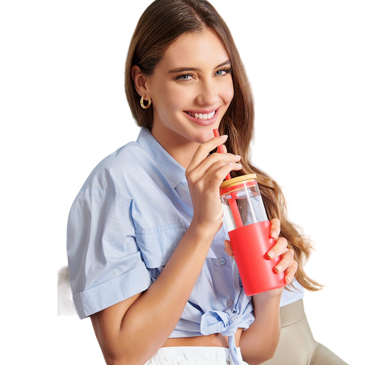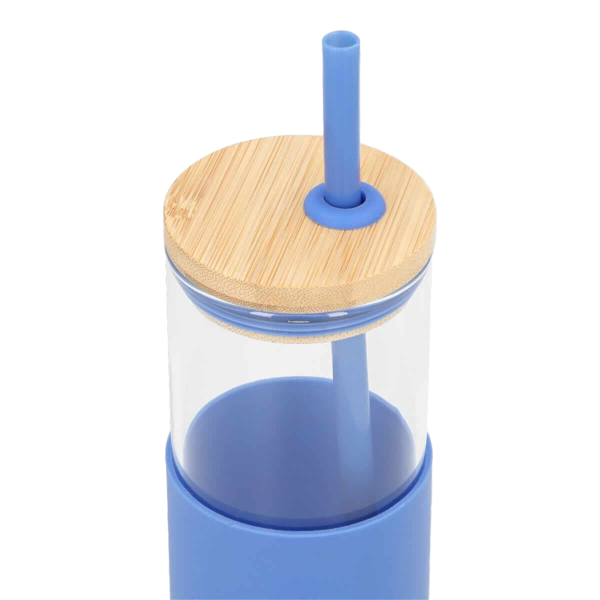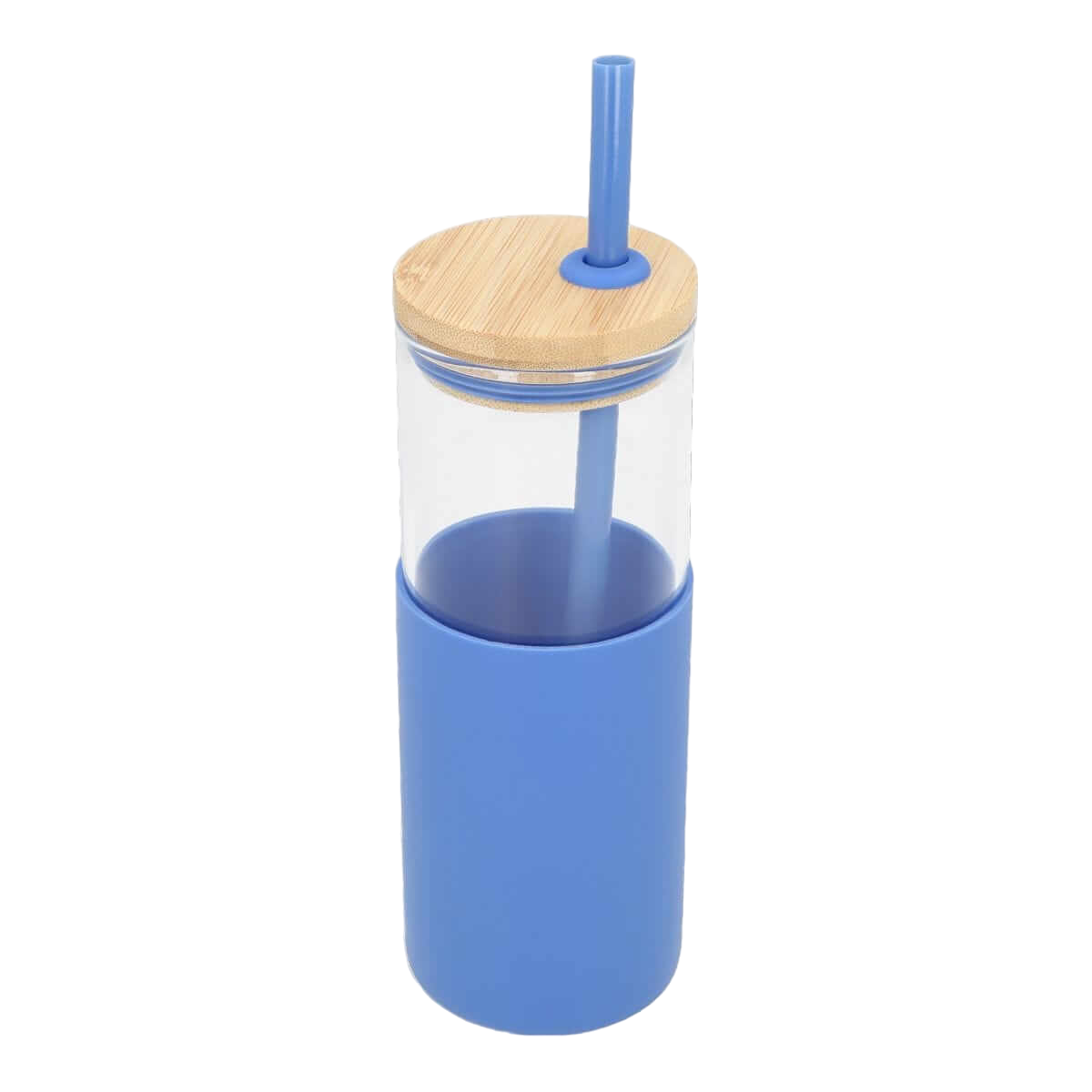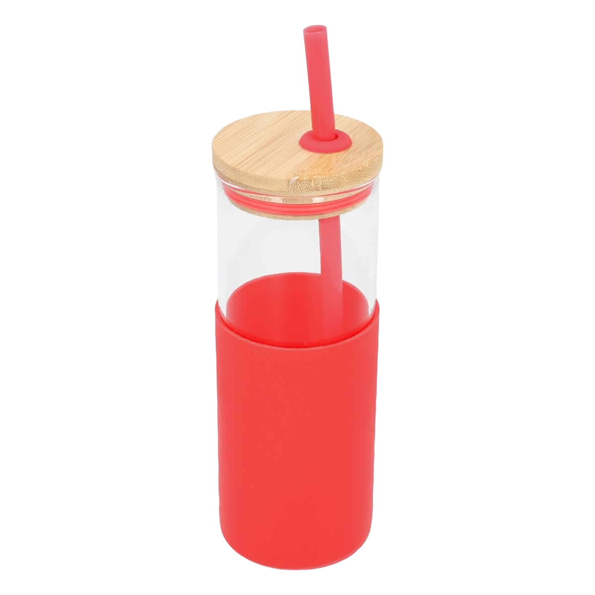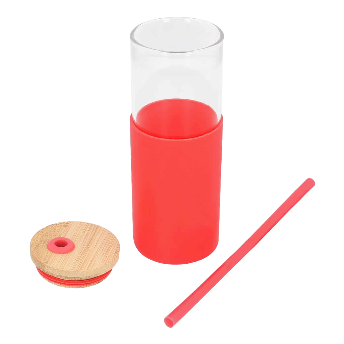 Cilindro de vidrio con manga de silicón removible, tapa de bambú y popote de silicón.