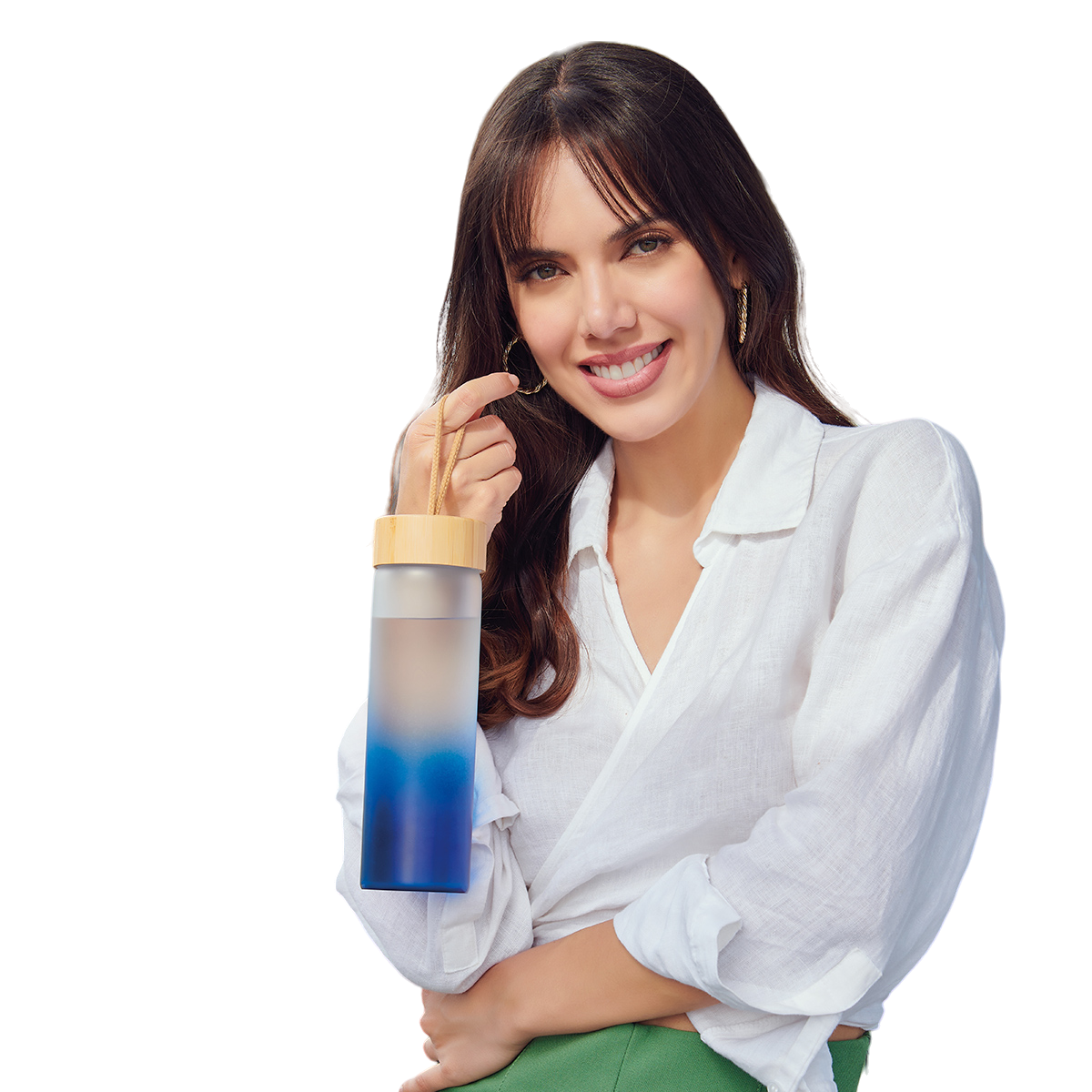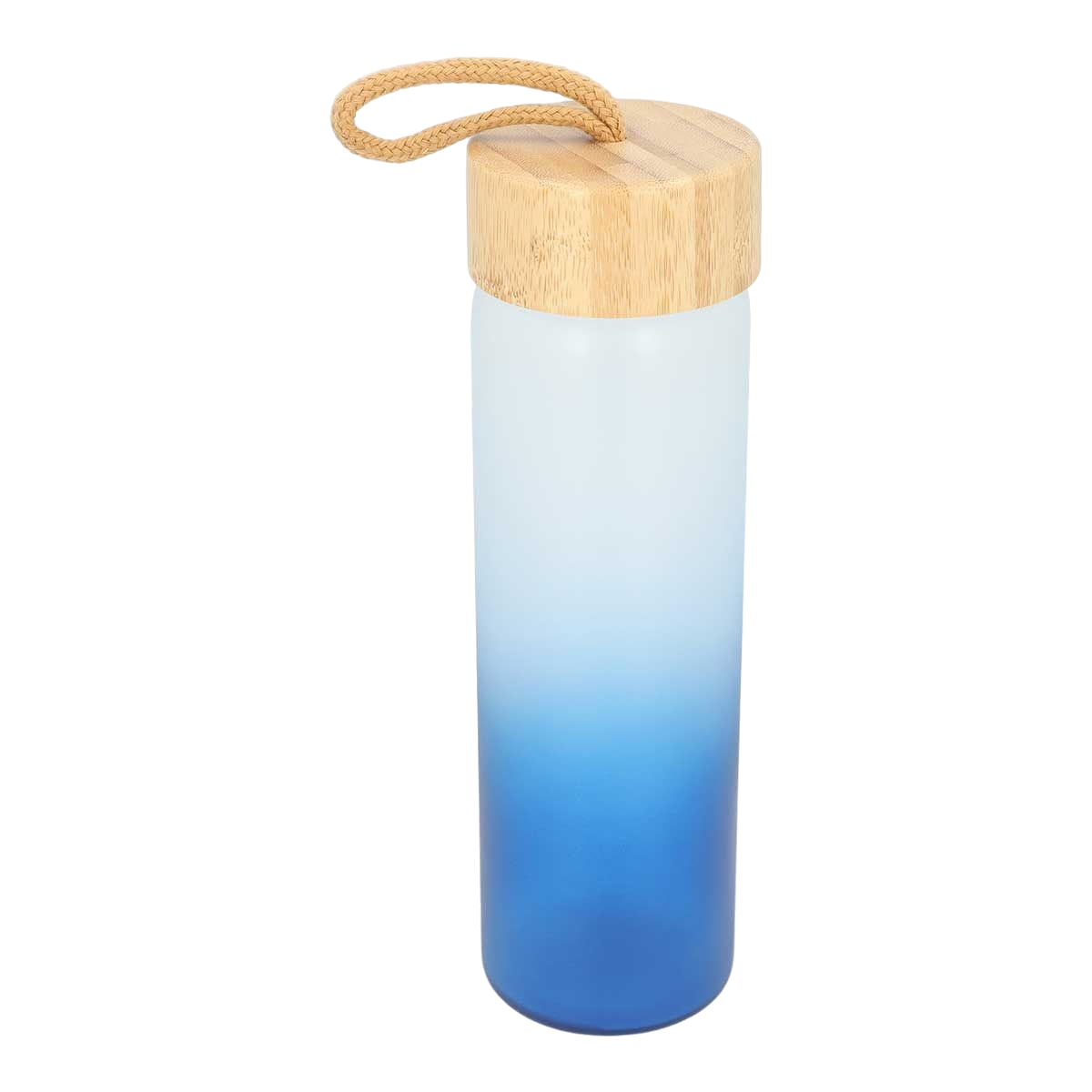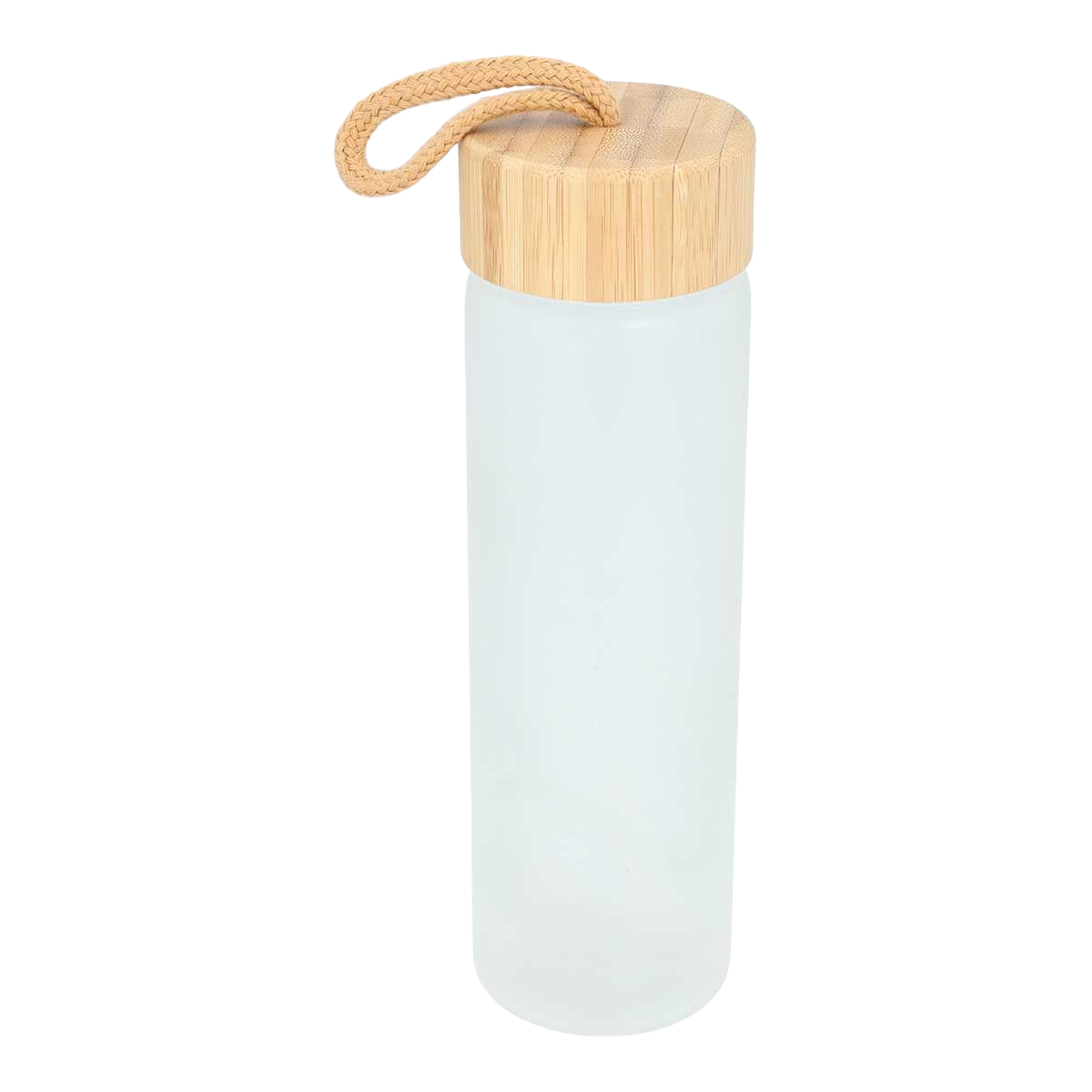 Cilindro de vidrio con tapa de bambú y asa.