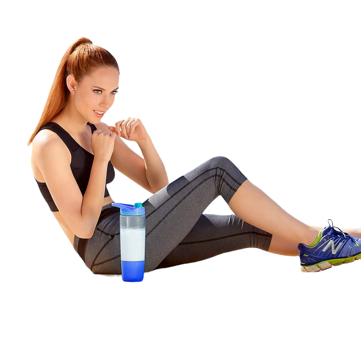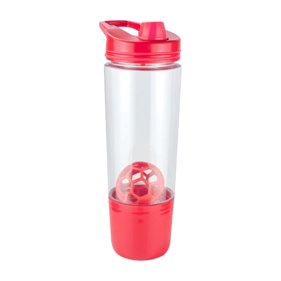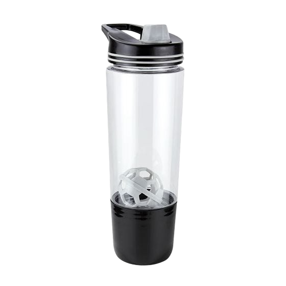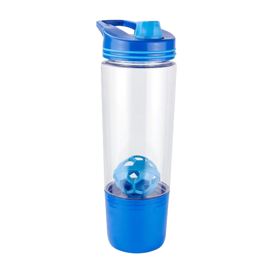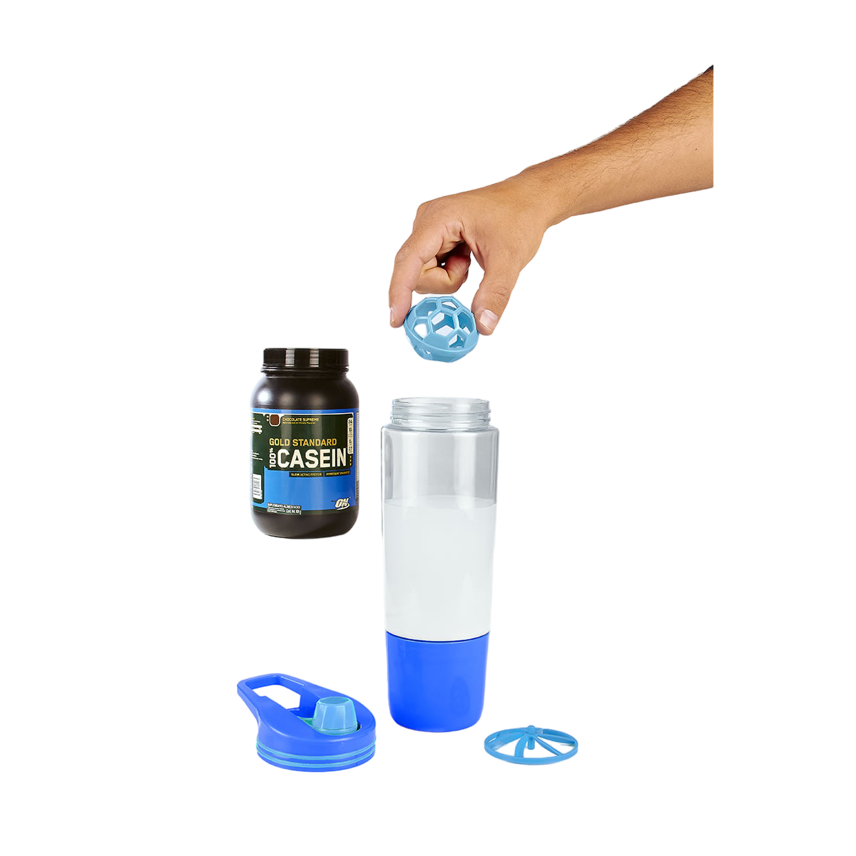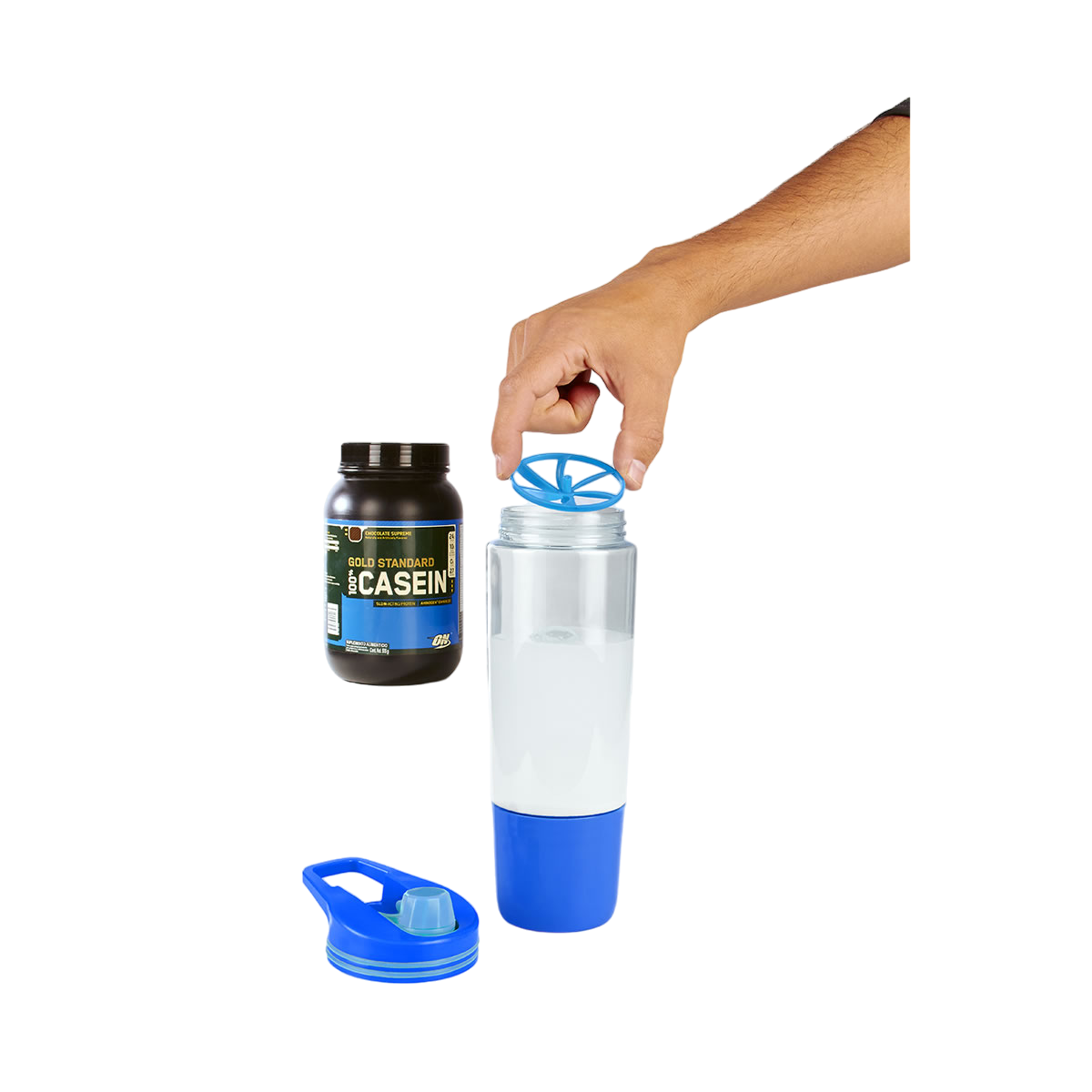 Tapa de rosca con boquilla y asa. Cuenta con compartimento especial en la parte inferior. Incluye separador, agitador y caja individual.