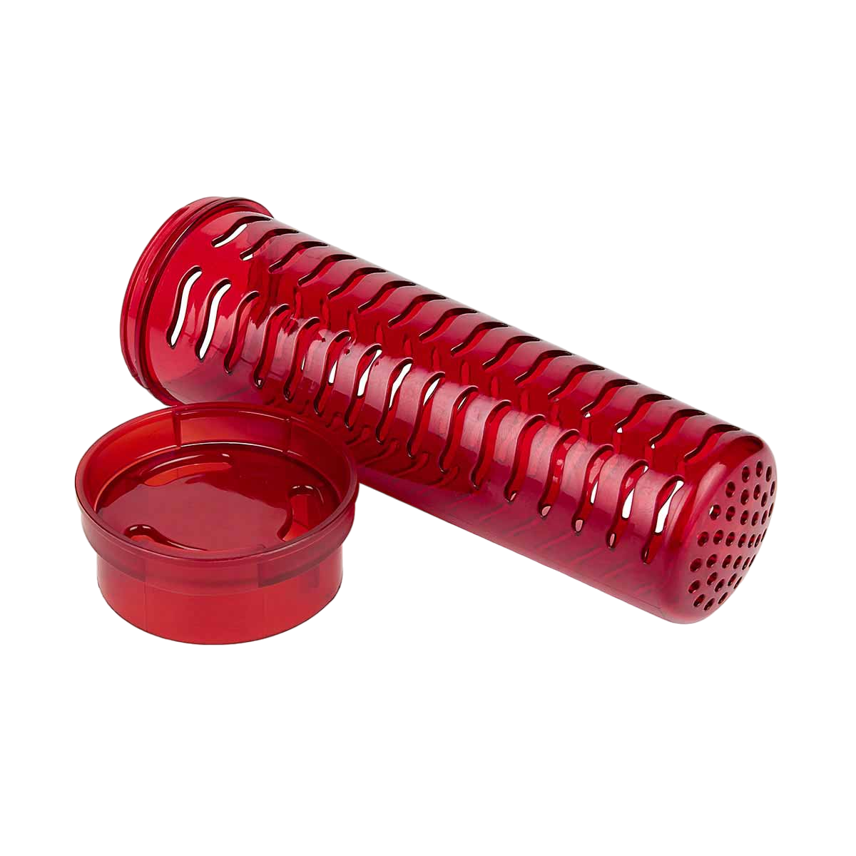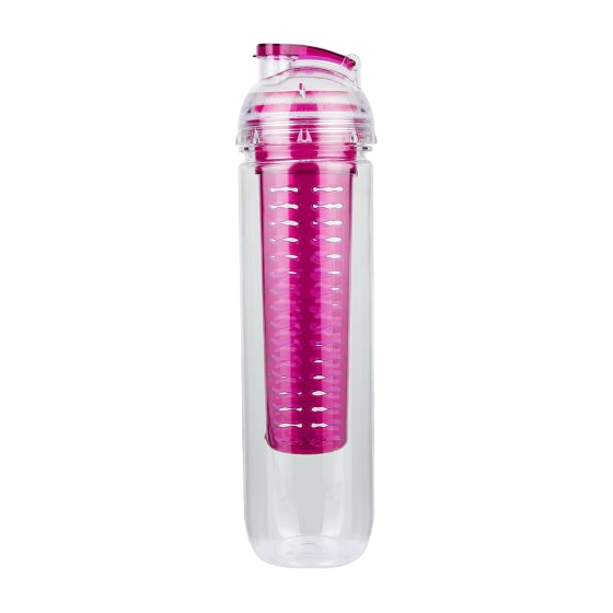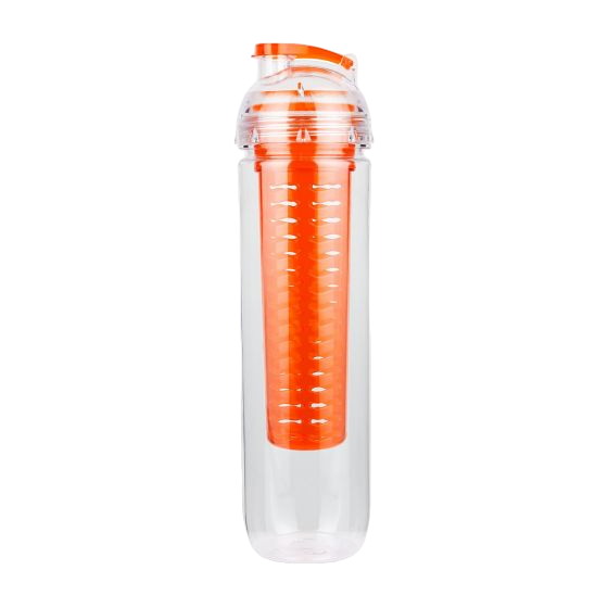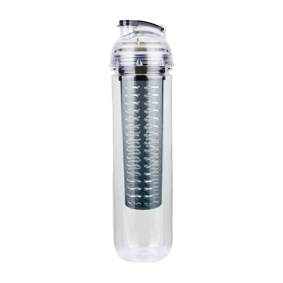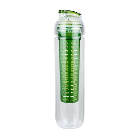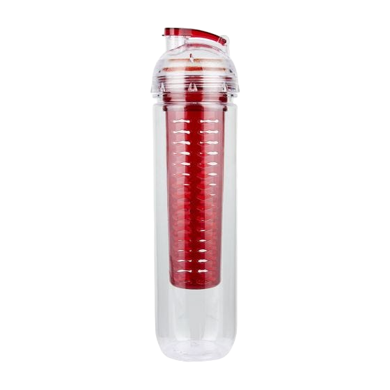Cilindro con infusionador para frutas o bolsas de té. Tapa con sistema de rosca boquilla y sobre tapa que cierra a presión.