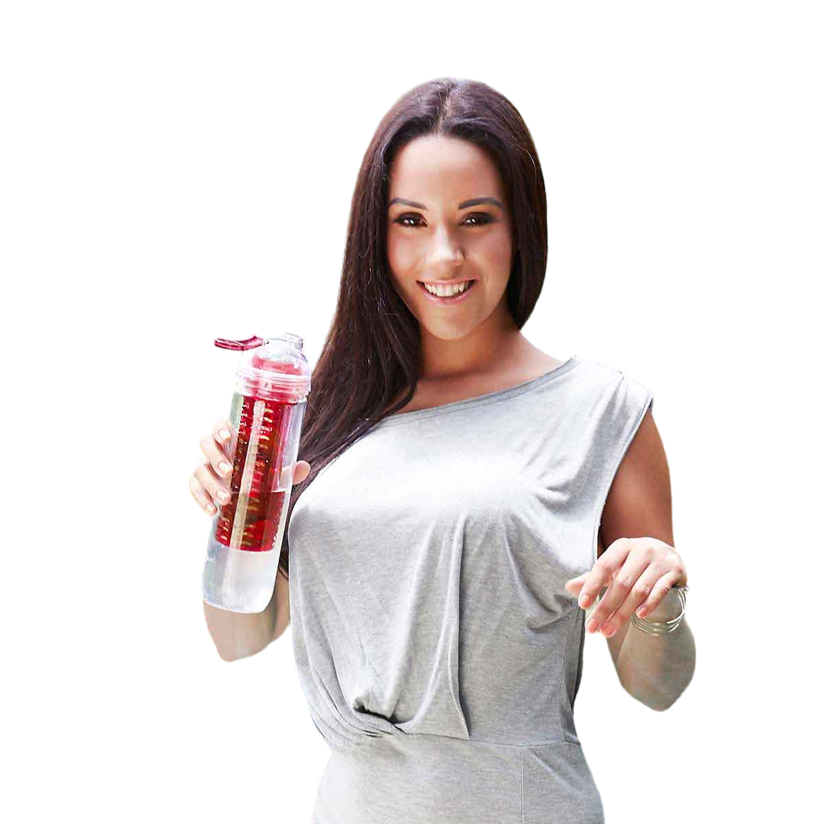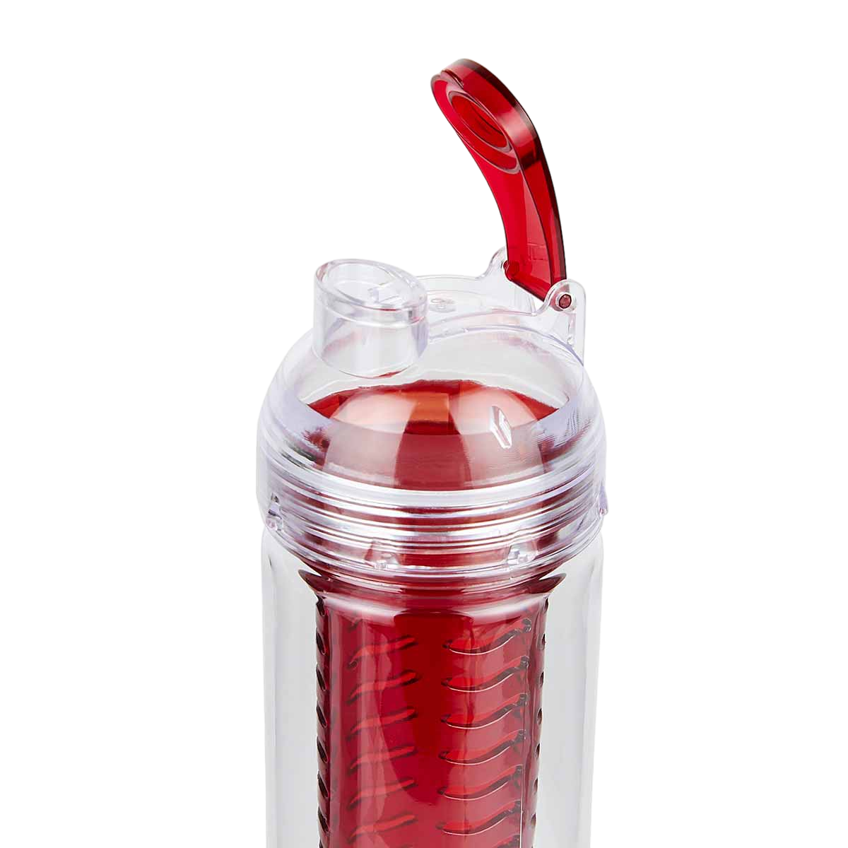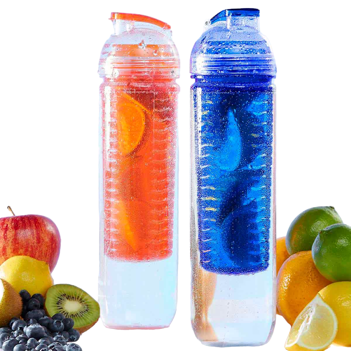 Cilindro con infusionador para frutas o bolsas de té. Tapa con sistema de rosca boquilla y sobre tapa que cierra a presión.