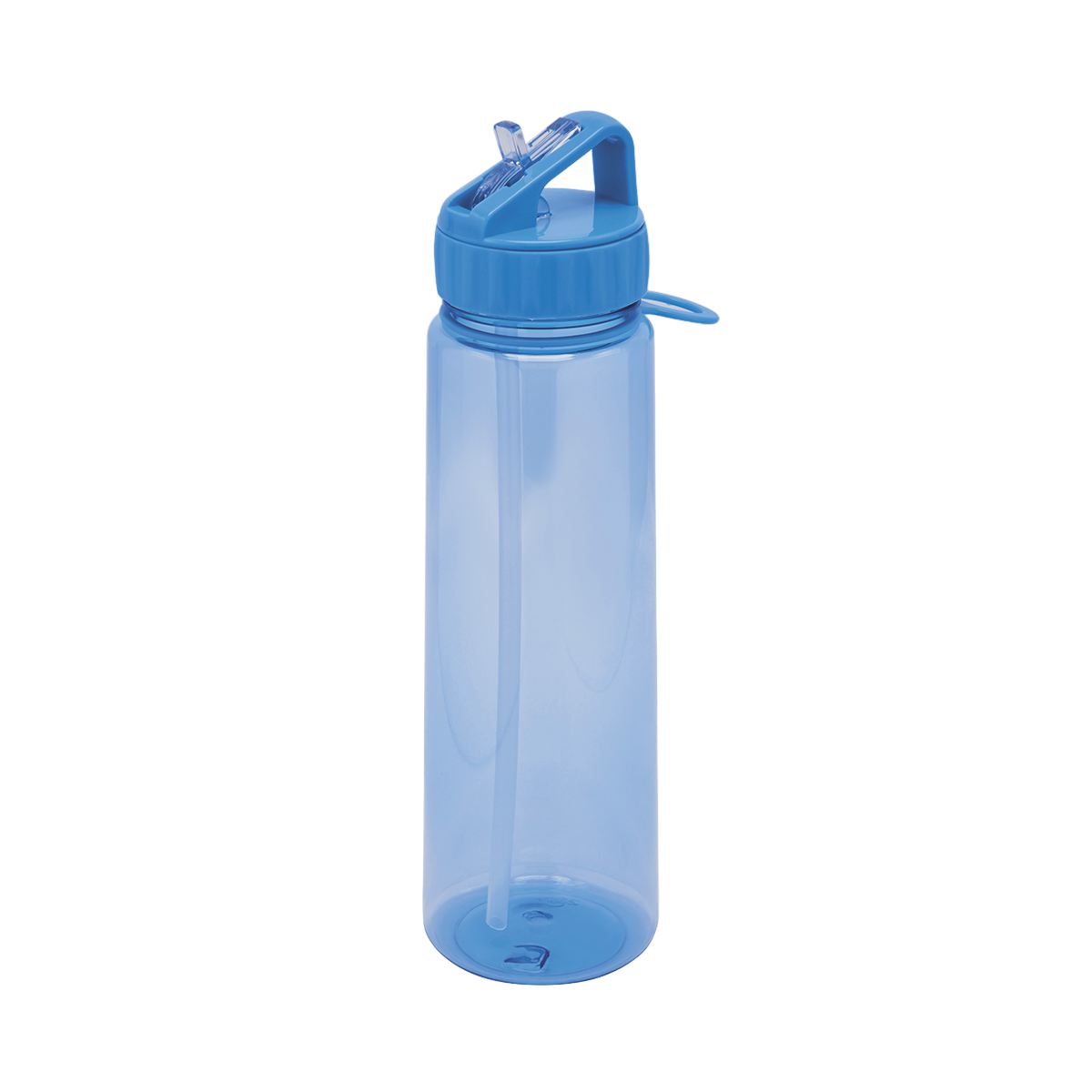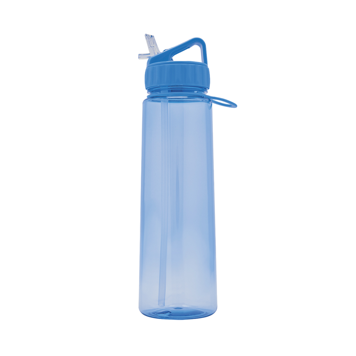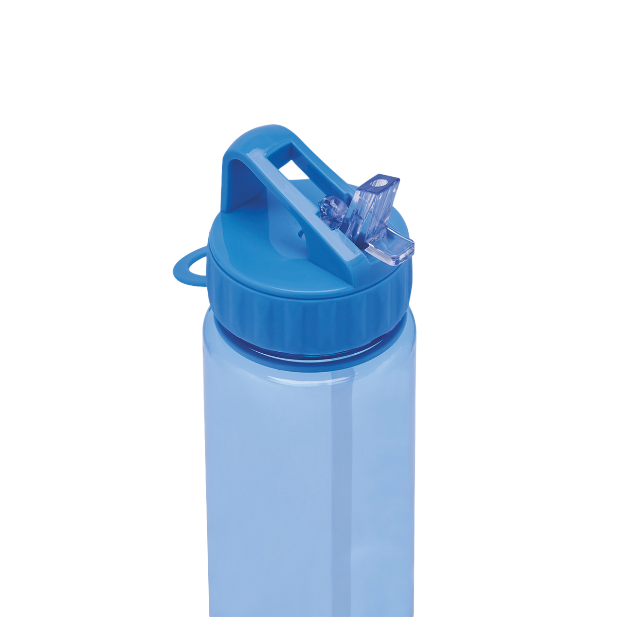 Tapa con cierre de rosca, asa y boquilla plegable para beber. Incluye popote y aro de silicón para colgar toalla, llaves etc.