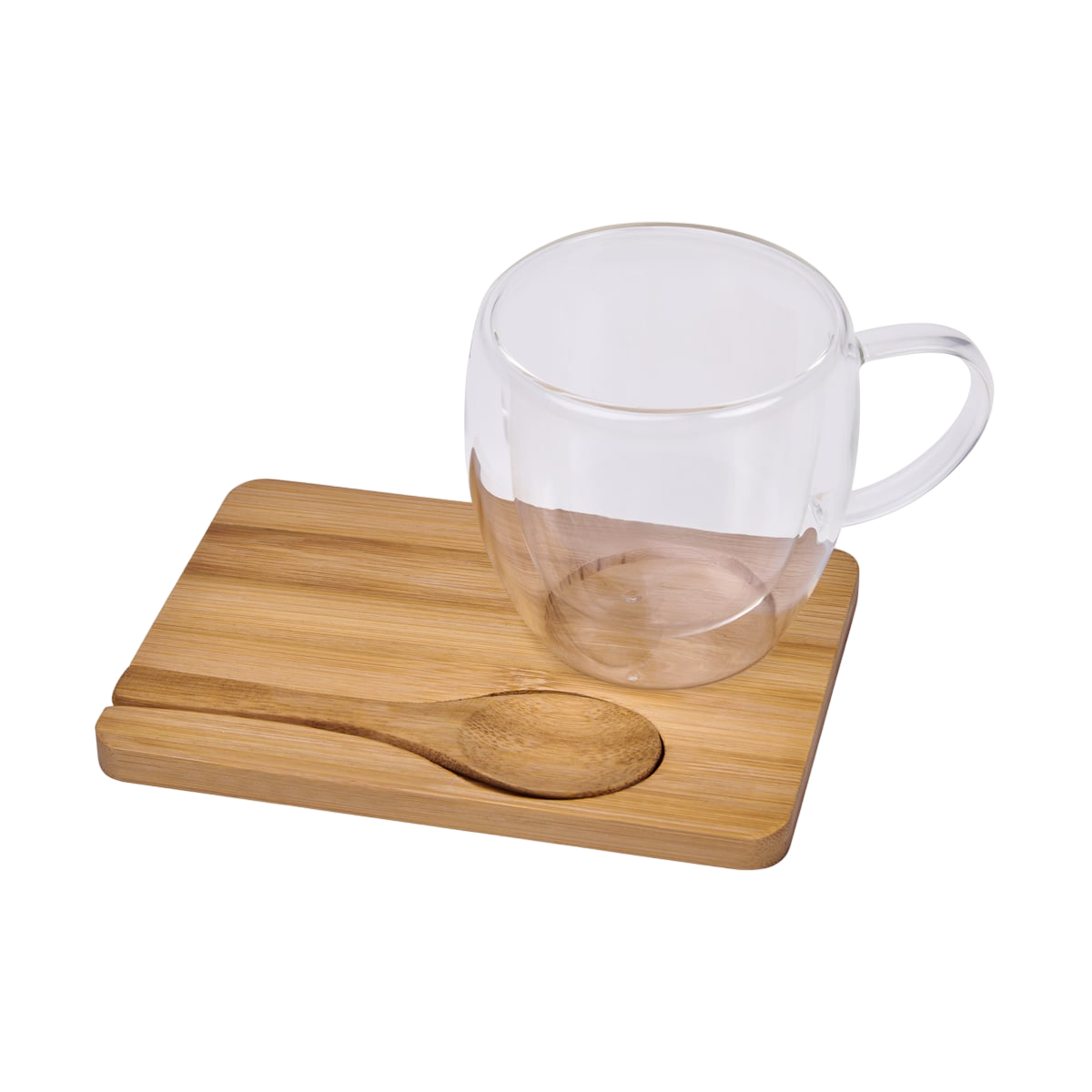 Juego de taza. Incluye 1 taza doble pared de vidrio resistente a bebidas calientes y frías, base y cuchara de bambú.