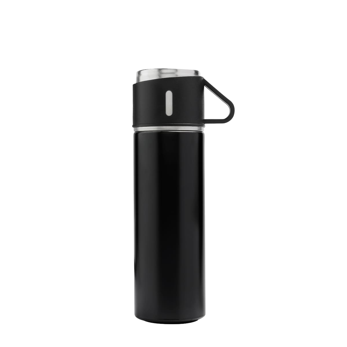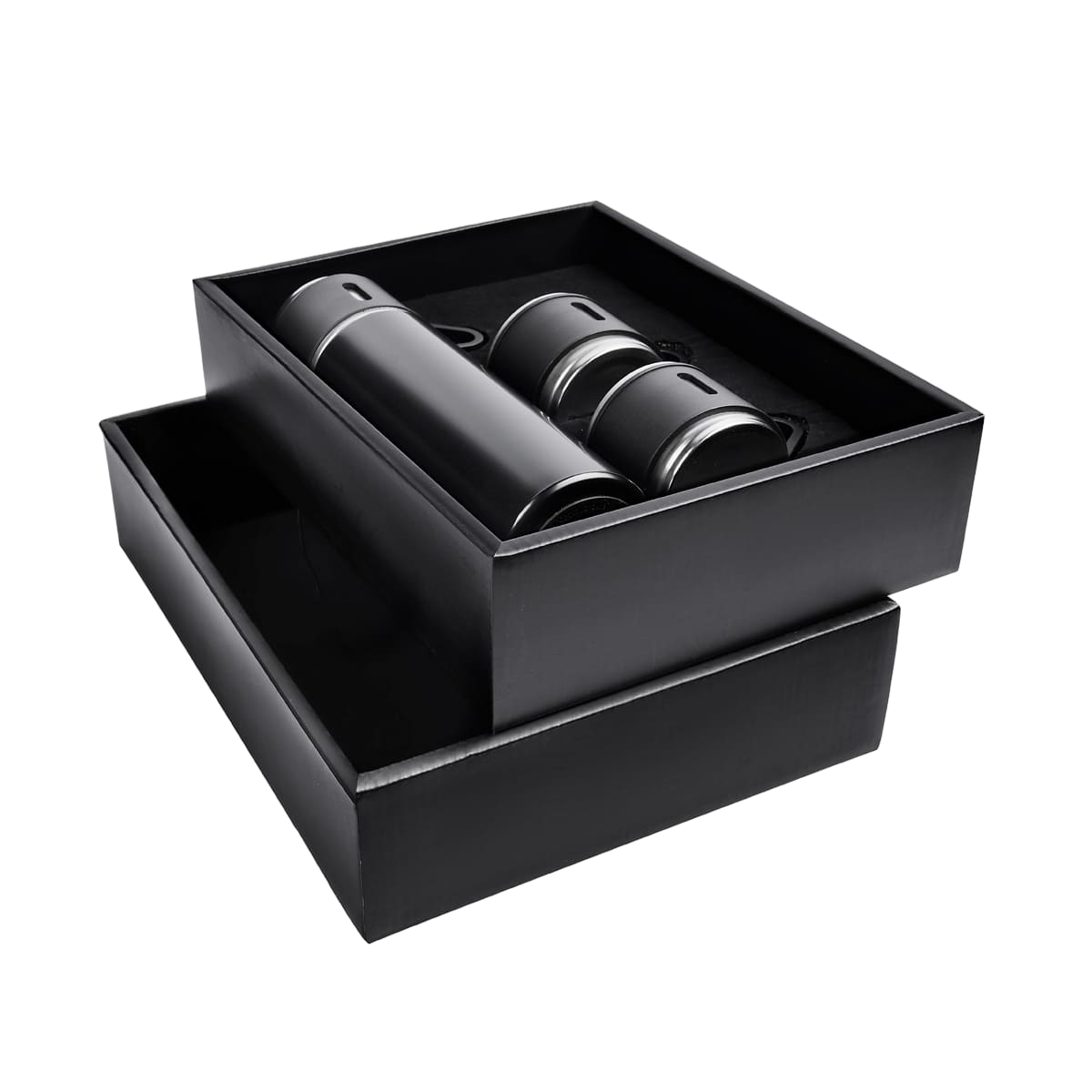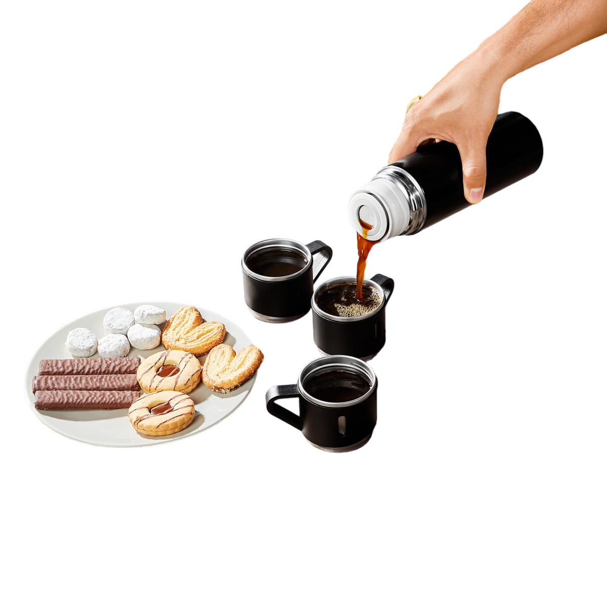 Set de regalo con 1 termo cuya tapa sirve como taza y 2 tazas adicionales. Termo doble pared cerrado al vacío, pared interna y externa de acero inoxidable, tapa interna de rosca con sistema push para verter fácilmente sin retirar el tapón, mantiene temperatura caliente 6 hrs y temperatura fría 8 hrs. Las tazas de acero inoxidable con un recubrimiento y asa de plástico.