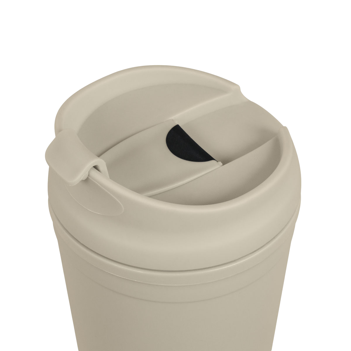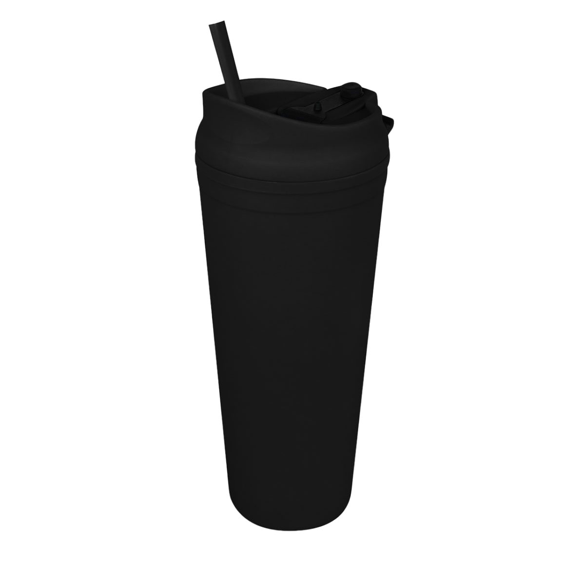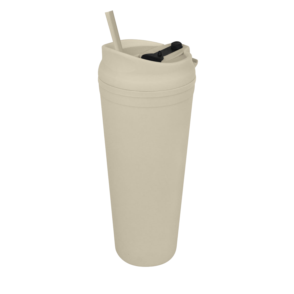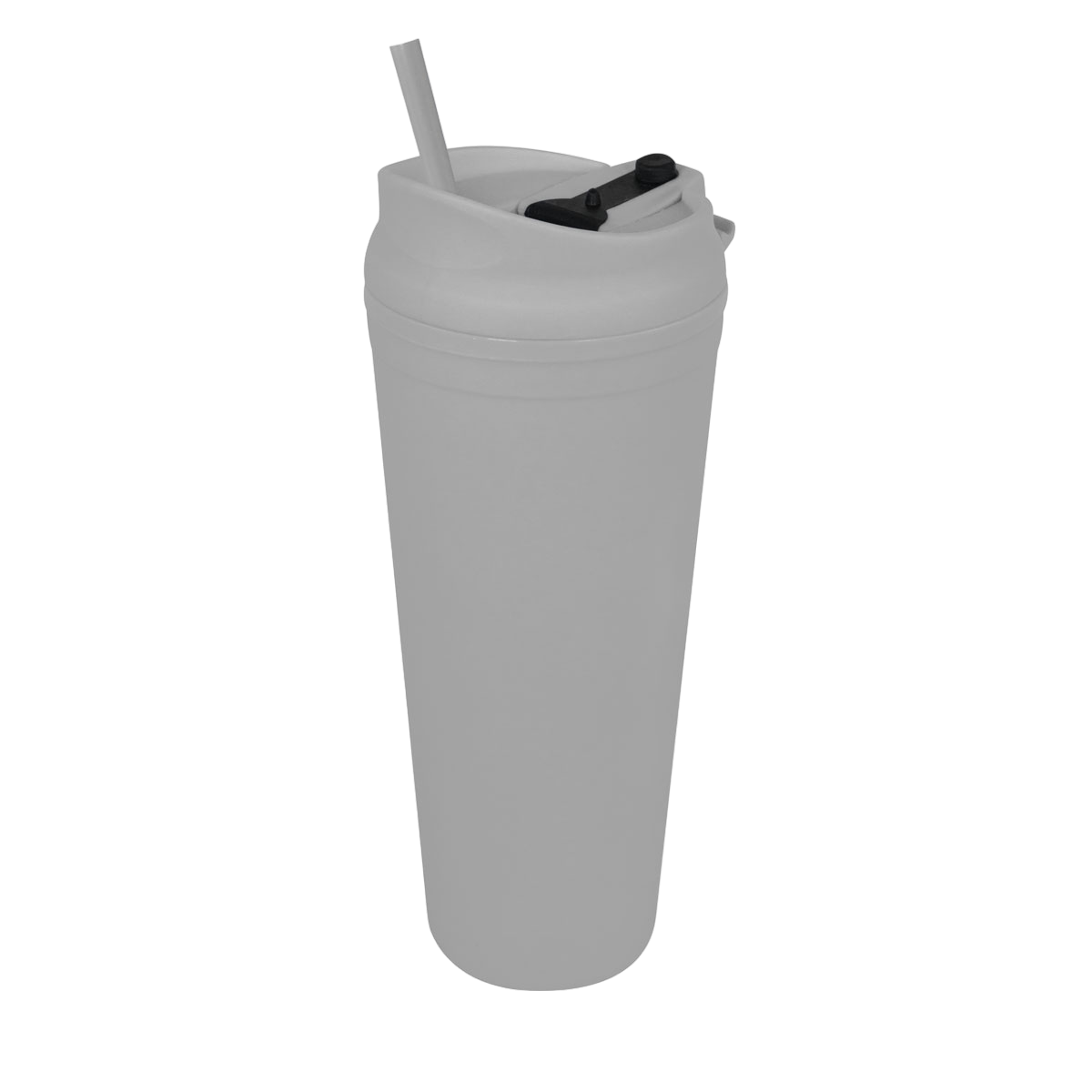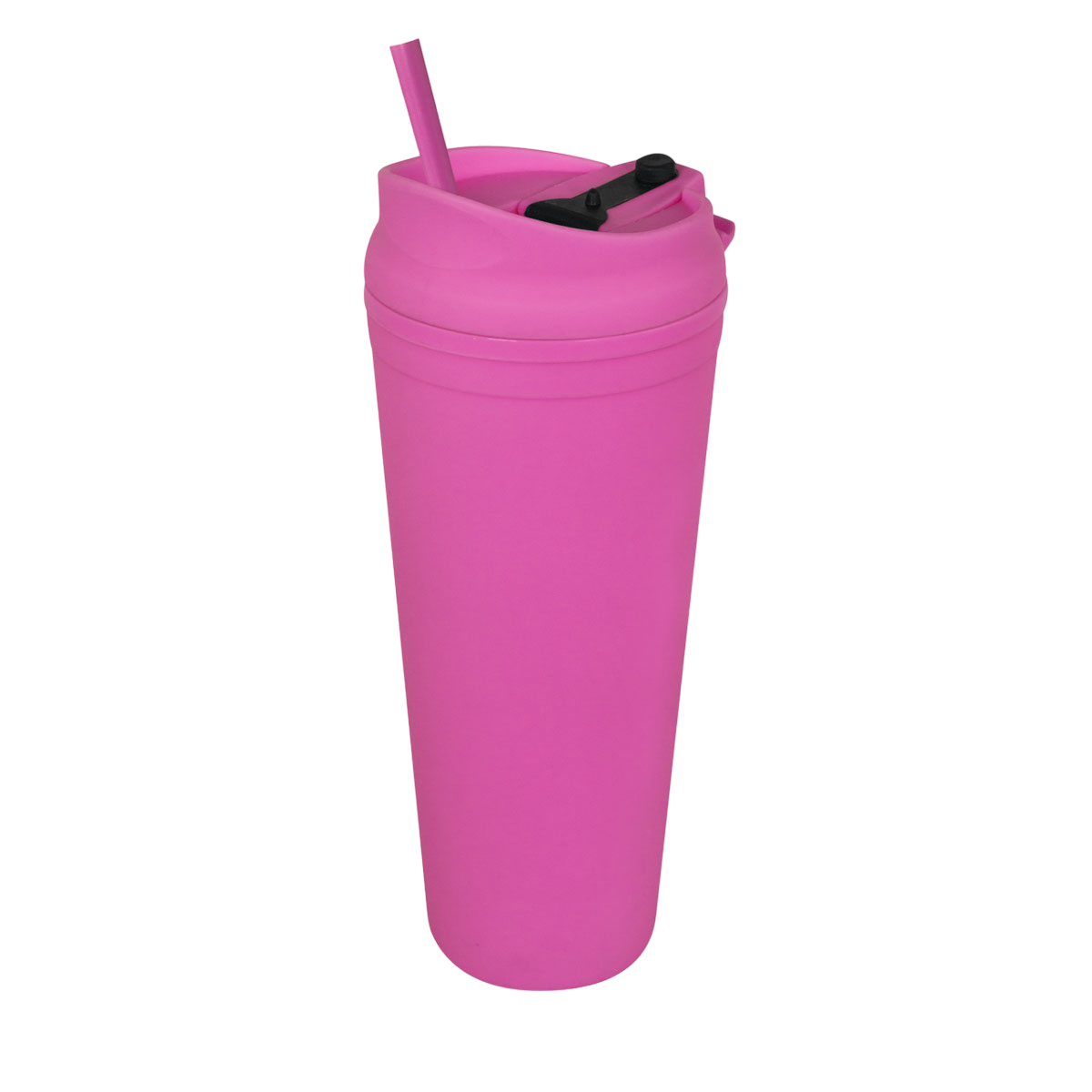 Doble pared. Pared interna y externa de plástico. Tapa de plástico con sistema de rosca. Sobre tapa con sistema de push. Incluye popote. Cuerpo y tapa con terminado tipo rubber. Caja individual incluida.