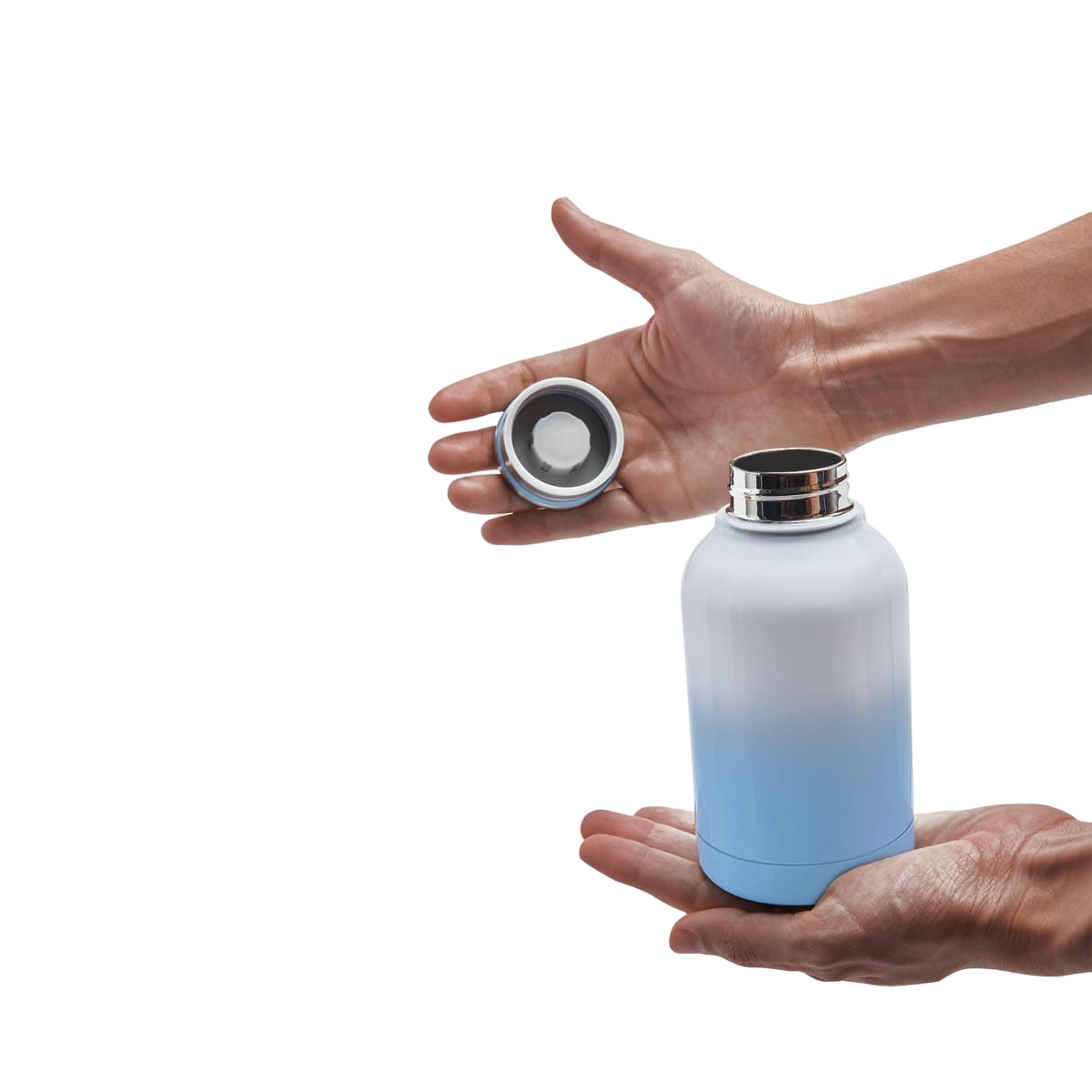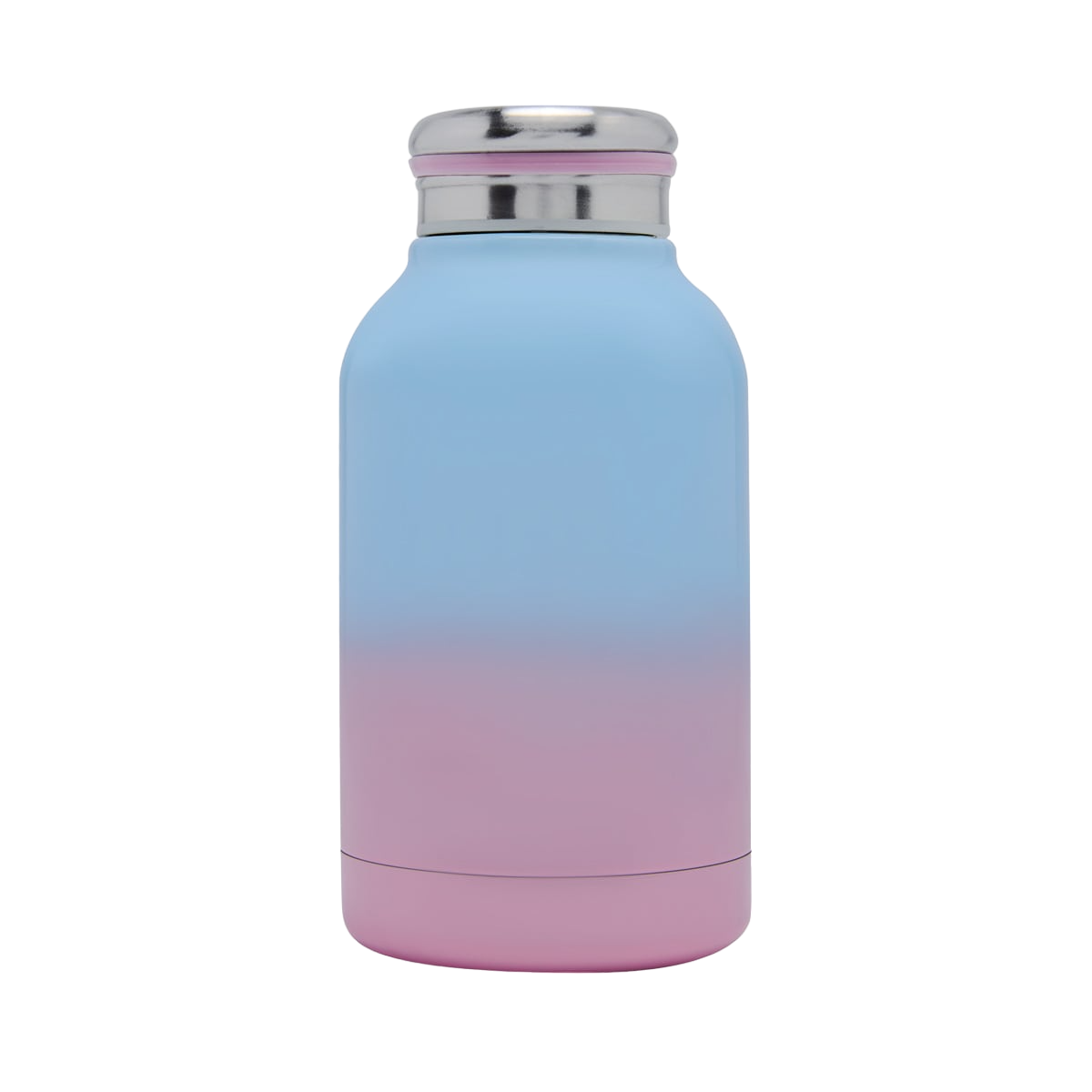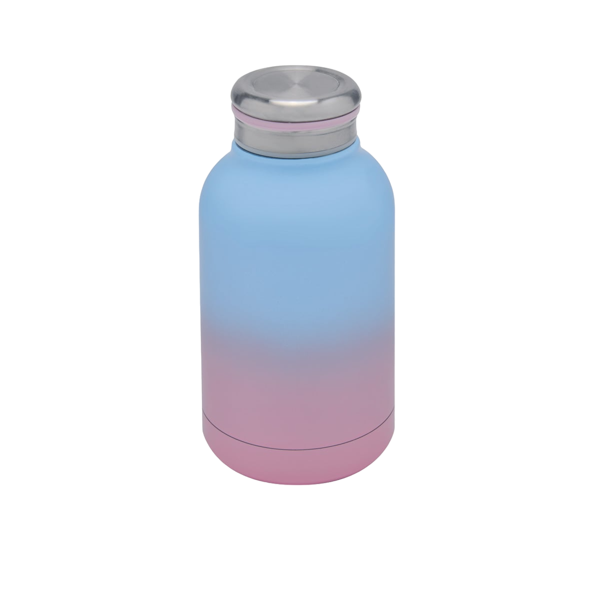 Mini termo color degradado. Doble pared. Cerrado al vacío. Pared interna y externa de acero inoxidable. Mantiene temperatura caliente 6 hrs y temperatura fría 8 hrs aproximadamente. Tapa con sistema de rosca. Termo pintado a mano por lo que el color y degradado pueden variar. Incluye caja individual.