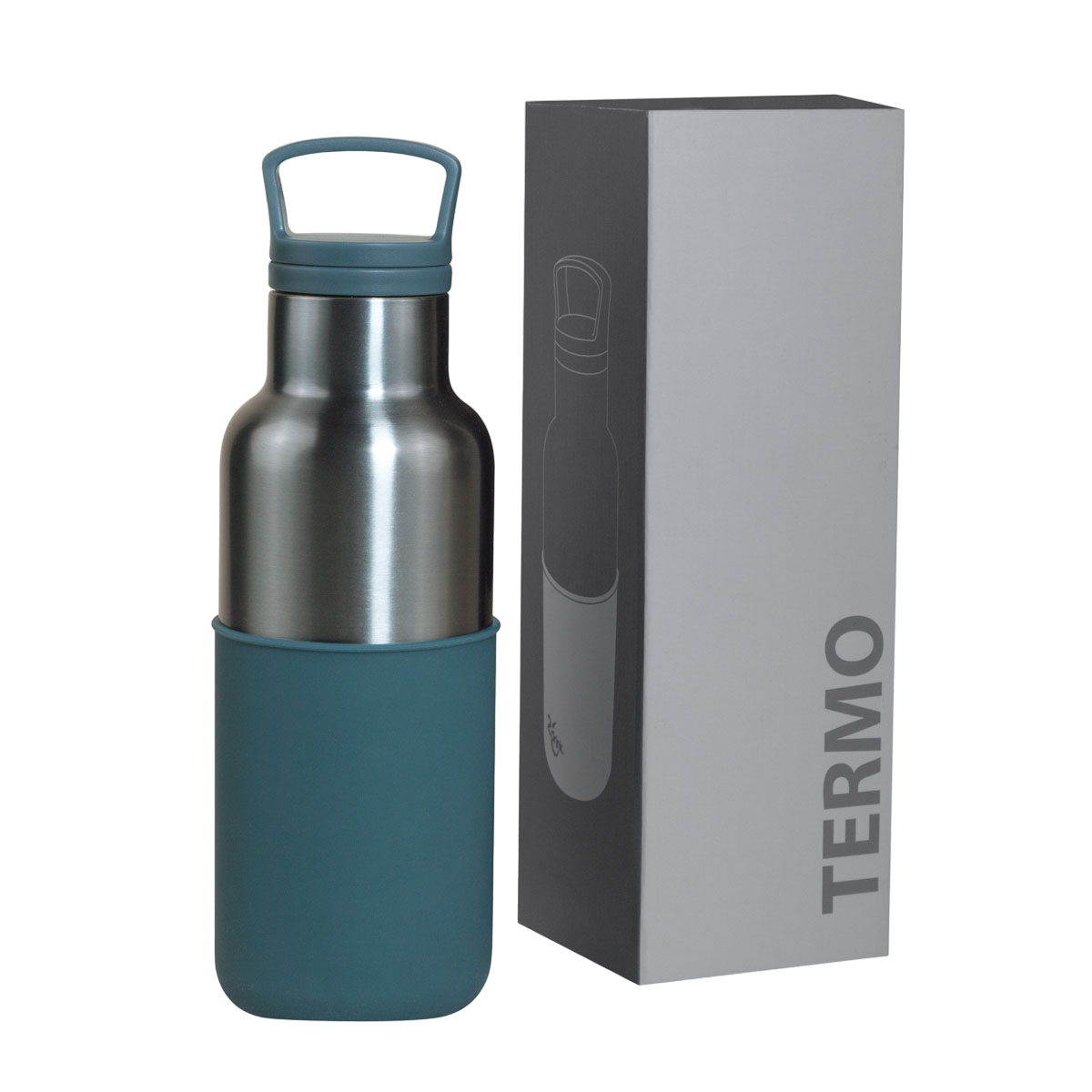 Doble pared. Cerrado al vacío. Pared interna y externa acero inoxidable. Tapa principal con sistema de rosca y asa. Incluye boquilla con filtro de plástico. Manga de silicón antiderrapante para un mejor agarre. Mantiene temperatura caliente 6 hrs y temperatura fría 12 hrs aproximadamente. Caja individual incluida.