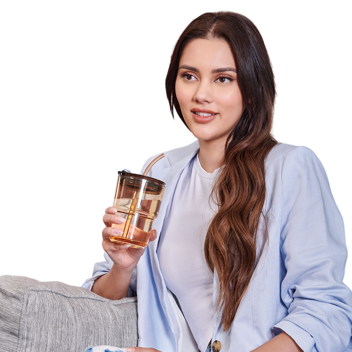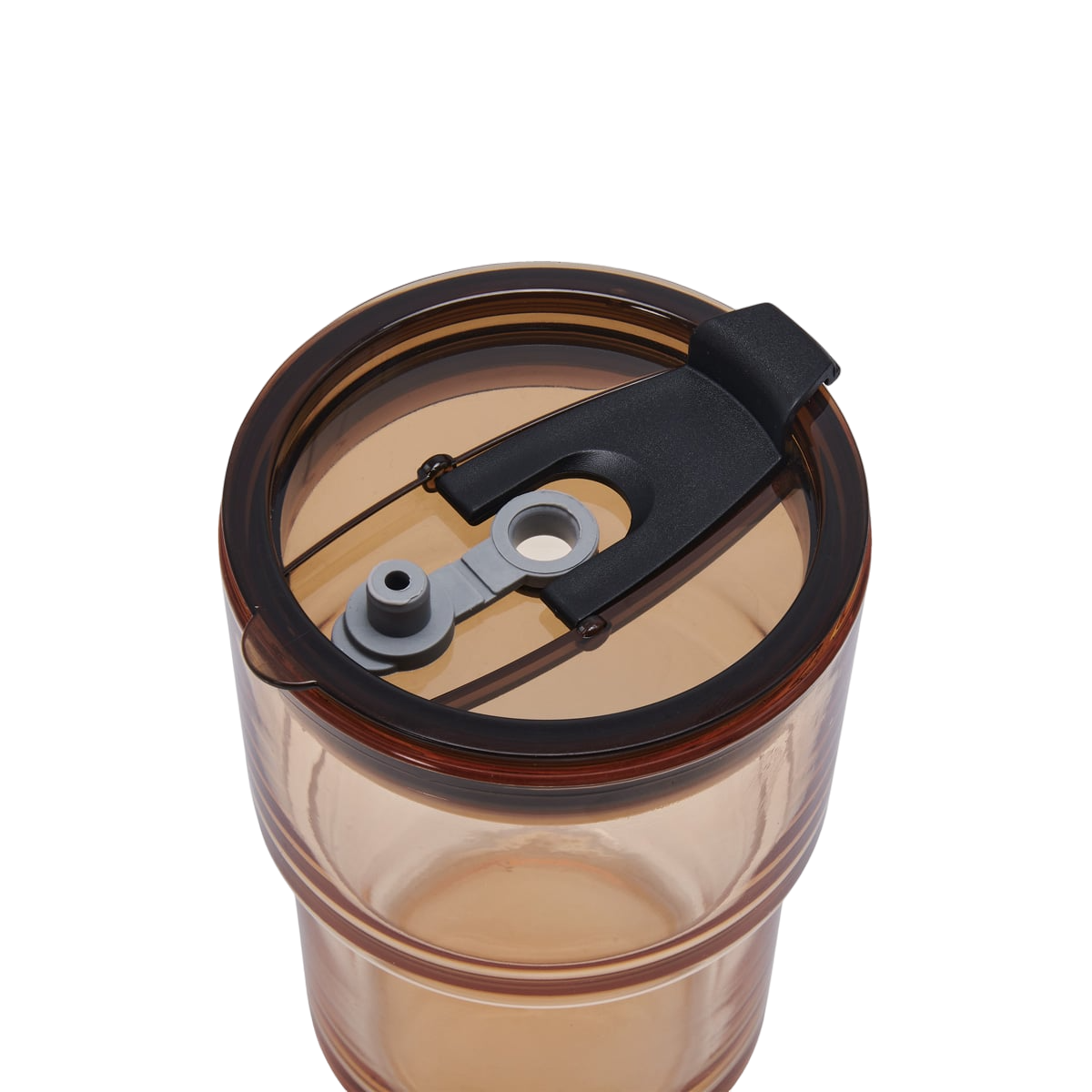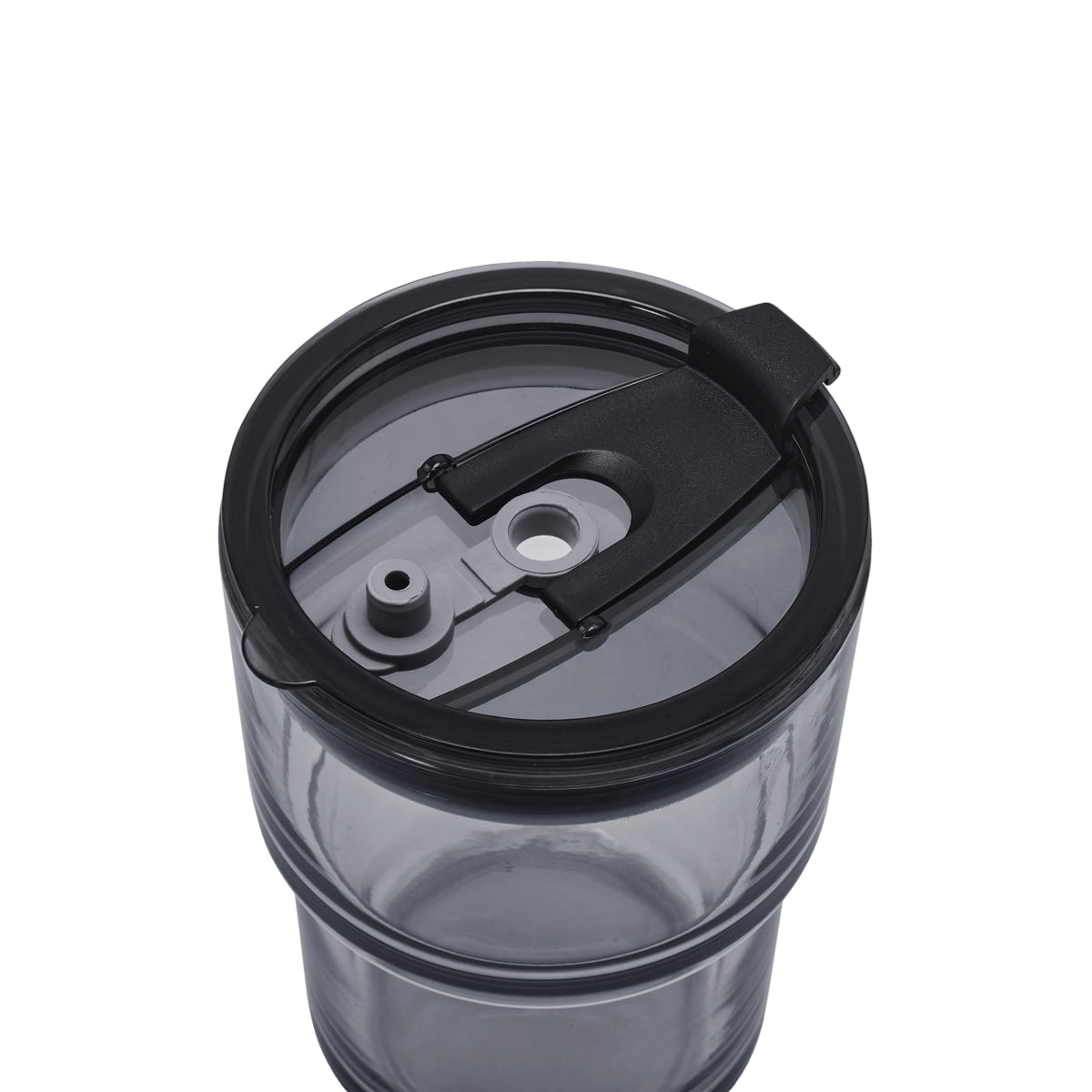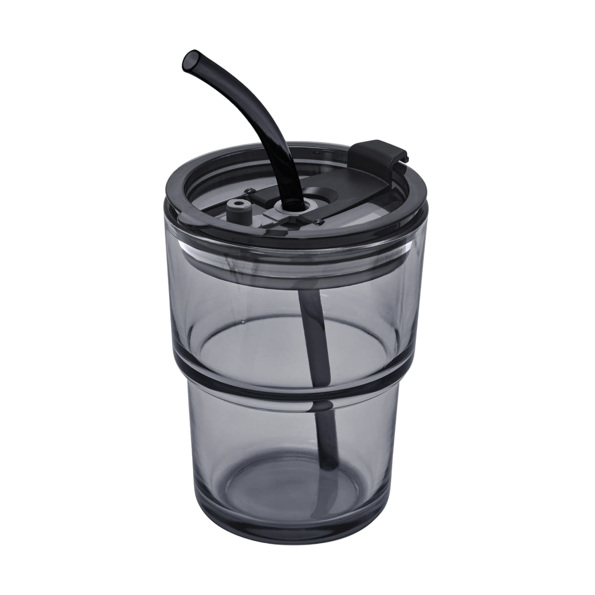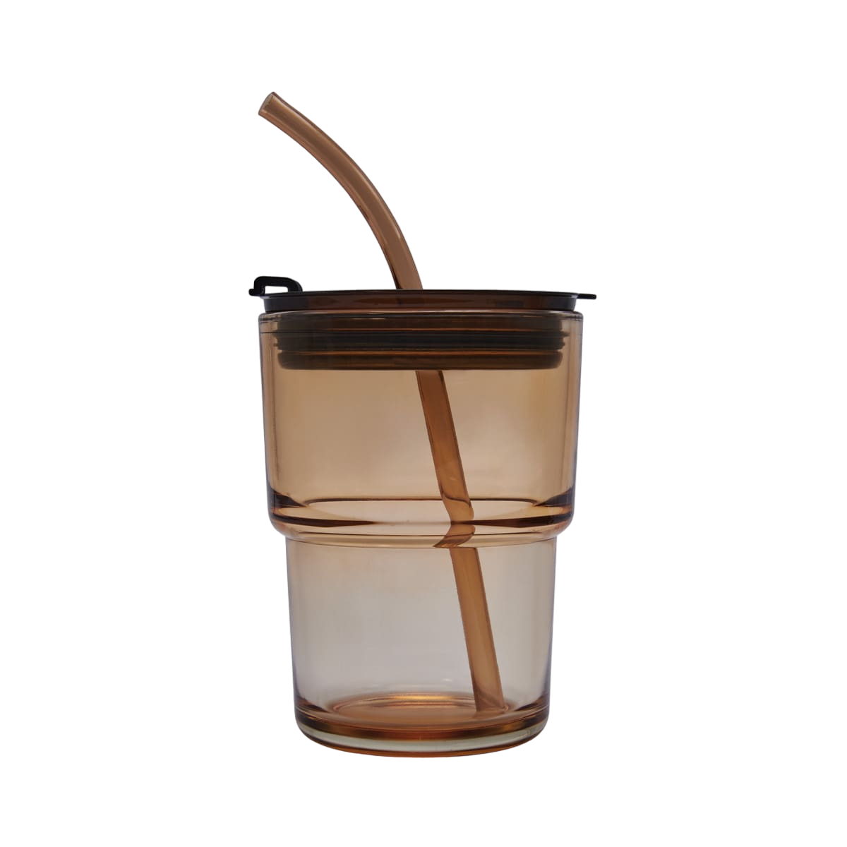 Vaso de vidrio de una pared. Tapa y sobre tapa de plástico con sistema push y ranura especial de silicón con tapón para popote. Incluye popote de plástico.